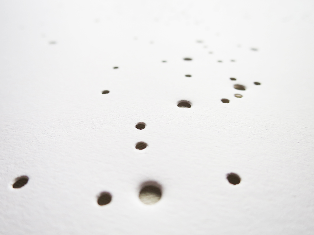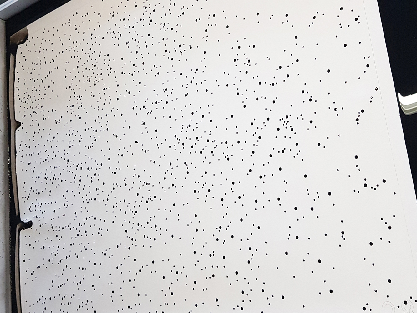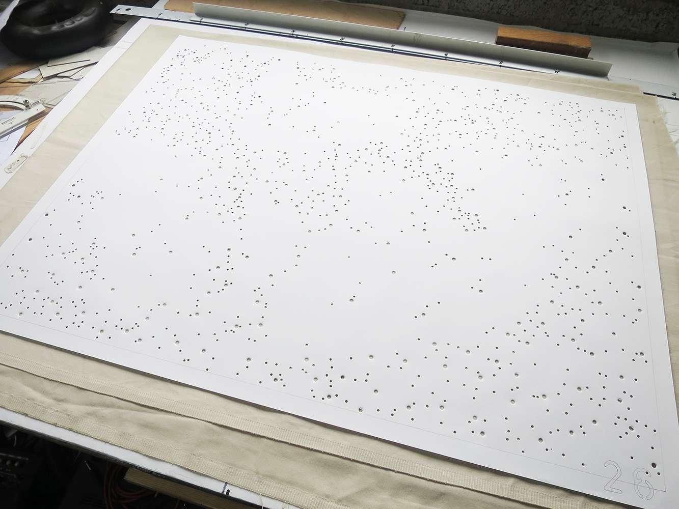 So, Dan studied Neal’s finely-honed technique and then developed his own method from that knowledge. So, in this respect the end result of these is different from Neal’s starmaps – different not better, just different - and with a slightly differently feel and look. Dan’s approach was to mask out the contoured summits or high points as indicated on the map – masking the full area of the contour – so there is much variation in the star size. Then the maps are sprayed with many light layers of paint. Dan also cut off and removed unrequired information (e.g. the key – as that would no longer function as the terrestrial is turned to the celestial), re-worked the cover page (so it just identified the area of the map) and then reconstructed the maps. Neal’s approach identified each summit and treated each of those as pin-pointed stars – resulting in a much tighter set of star sizes. He also kept the associated terrestrial information and cover pages as a way to more texturally identify the original landscape.