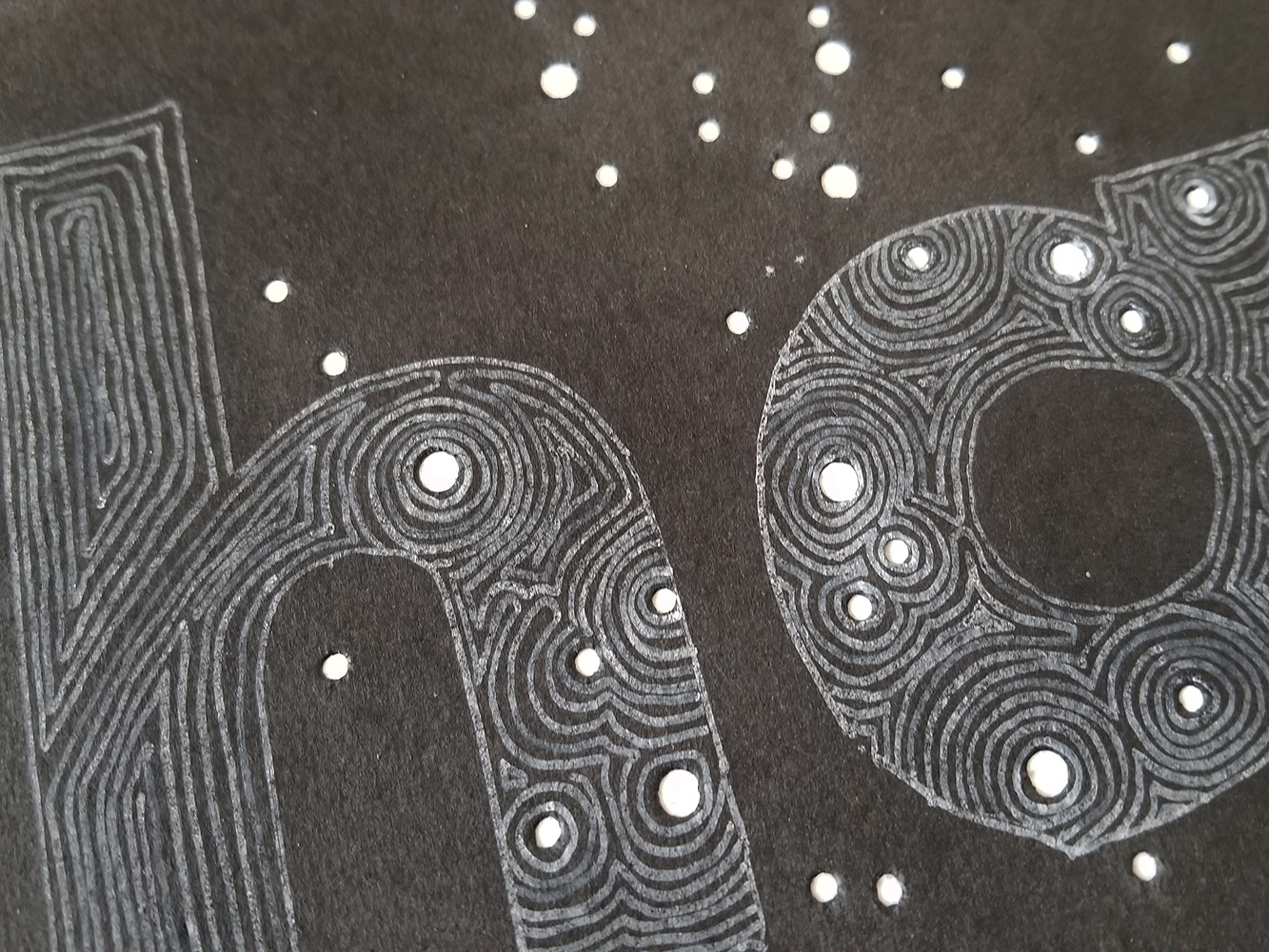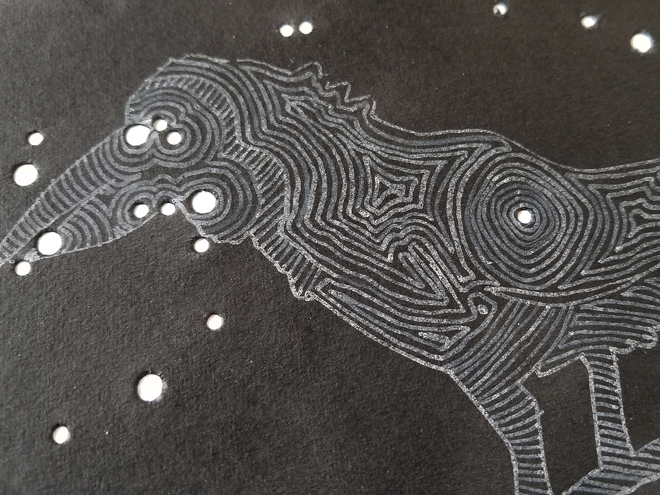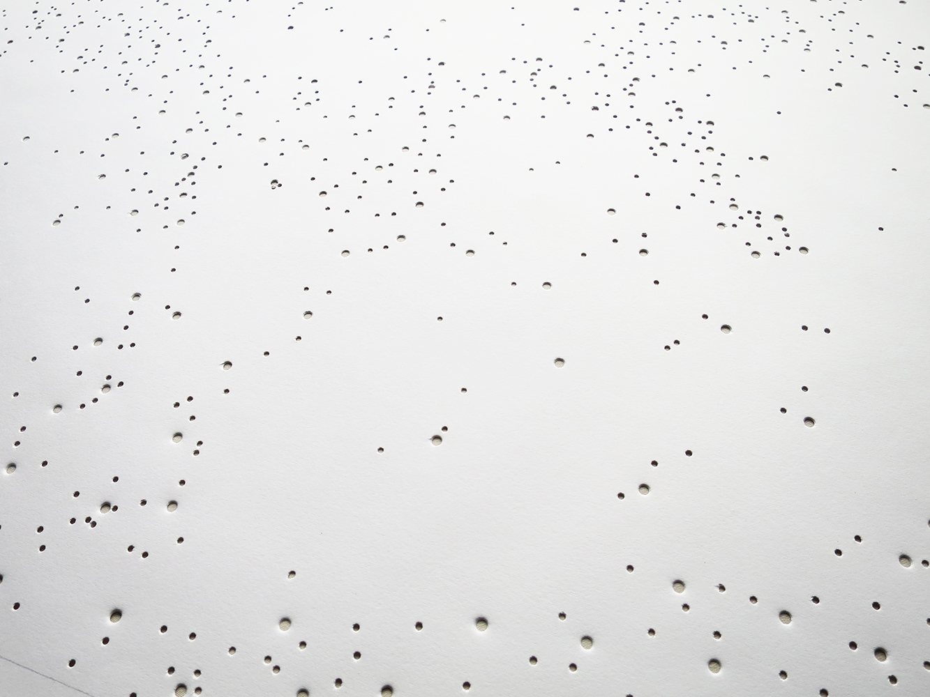 So, Dan studied Neal’s finely-honed technique and then developed his own method from that knowledge. So, in this respect the end result of these is different from Neal’s starmaps – different not better, just different - and with a slightly differently feel and look. Dan’s approach was to mask out the contoured summits or high points as indicated on the map – masking the full area of the contour – so there is much variation in the star size. Then the maps are sprayed with many light layers of paint. Dan also cut off and removed unrequired information (e.g. the key – as that would no longer function as the terrestrial is turned to the celestial), re-worked the cover page (so it just identified the area of the map) and then reconstructed the maps. Neal’s approach identified each summit and treated each of those as pin-pointed stars – resulting in a much tighter set of star sizes. He also kept the associated terrestrial information and cover pages as a way to more texturally identify the original landscape.