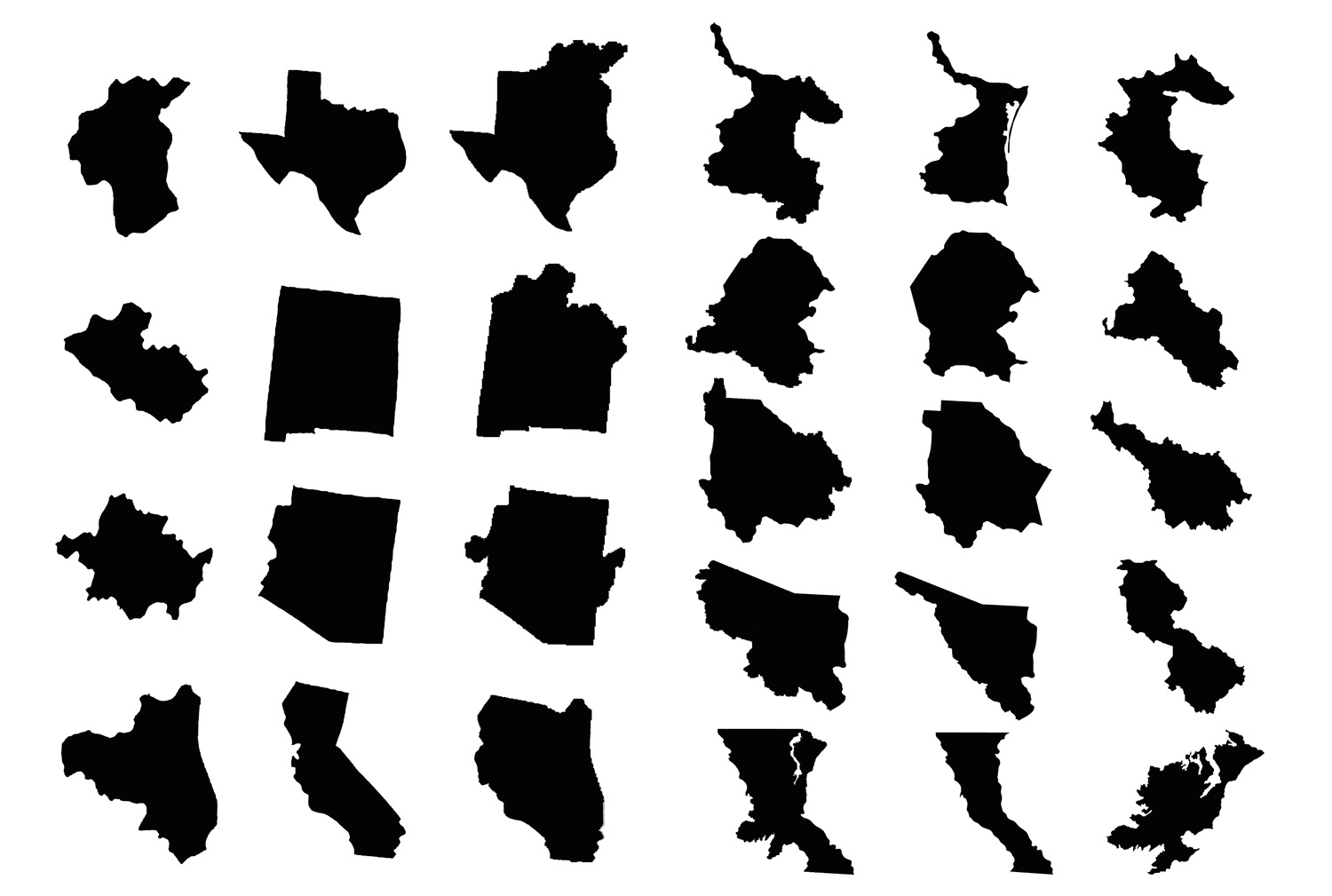 The two graphic images above come from the design and research process of playing with state and county borders, particularly those on either the US and Mexico border and those on the Republic of Ireland and Northern Ireland border. It turns out that you can numerically and positionally match up the number of states and counties quite well – so the ROI counties match up with the Mexican states and the US with the Northern Irish (this brings some interesting conceptual play-offs in itself). For example, west to east: California would mix with Londonderry, New Mexico with Fermanagh, Arizona with Tyrone and Texas with Armagh. Then it is possible to also overlay and create hybrid states. The resulting graphic shapes begin to form Rorschach type shapes and doing this the work starts to create imaginative links and new territories. In this sense it intermixes culturally across two borders, four nations, numerous states and many counties, which perhaps is a reality that history often finds difficult to express and hold in the popular imagination.