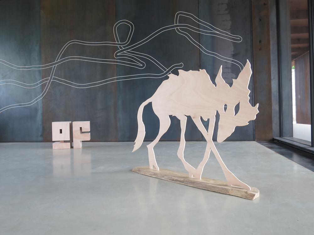 The wolf appeared in a project in Nantes in a work called Lumiere de Loup (Nottanum, 2017) where it acted as a double edged symbol of threat, fear and predjudice (a mythology in story-telling and amplified in modern times through the screen, where wolves act as a threat to society - the other, the foreigner, the monster) but also in reality as a beautiful and an essential component of a fragile ecology. The standing sculptural plwood and wood wolf made for the Lament of the Accolade Tree features in the Another Fine Mess exhibition as the wolf again clearly resonates with this material and context.