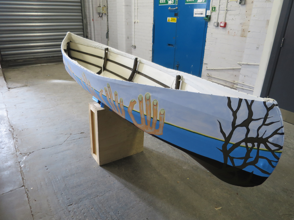 This canoe structure is Shipsides and Beggs’ own design based on a hybrid between a traditional Native American / Canadian canoe - a pioneer era canoe and a traditional Irish currach - a wooden frame over which material is stretched and painted. It’s one of two canoes made for the Another Fine Mess project.
