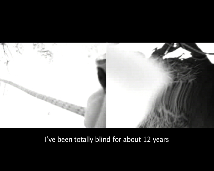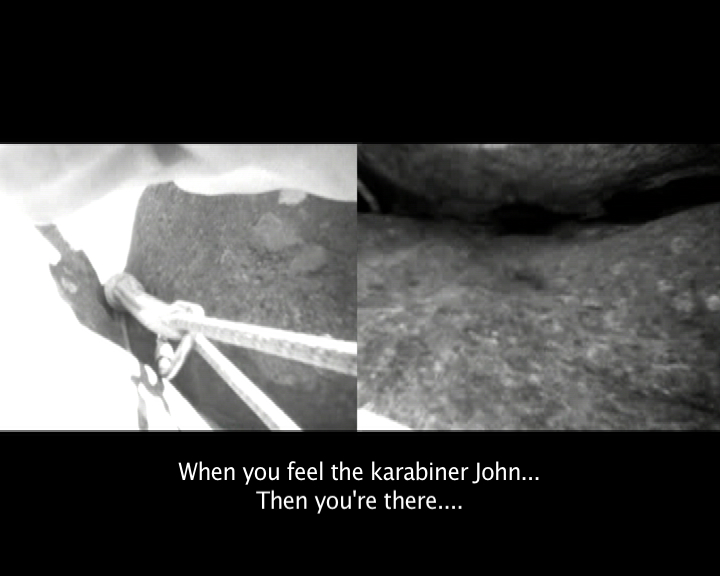 This work develops from a malfunction of the finger tip footage of a climb with John (a blind man) in Donegal at Dumore Head. The black and white footage is taken from just the finger cameras and is very abstracted because of the sunny day which solarized parts of the footage – making the sun itself appear black. It is in real-time and is approximately 12minutes long. During this climb the cameras started to malfunction on the short descent poetically adding to the sense of visually trying to record a physical or tactile experience.