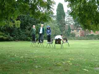 Video made during experiment to traverse an area without touching the ground using chairs . A camera was attached beneath one of the chairs.