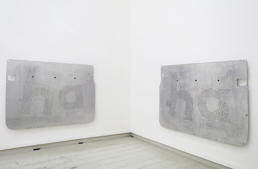 So anyway, I needed to replace some damp wooden slide door panels in my VW van and so I decided to use dibond - a material which would not hold moisture and therefore would be a better material to use. My children and I love travelling in the van on adventures to the sea or the mountains and we love waking up in new places, sliding the doors open to the often (but sometimes not so...) fantastic views. So it seemed pertinent, and fun, to drill, with hundreds of holes, the words ‘ha’ ‘ha’, one for the left door and the other on the right door, to celebrate or mark the moment and to recognize the time and space we are in. It’s fun too because opening and closing the two slide-doors physically acts as the articulation of a reciprocal laugh. So, every time we open the doors we make life, art and laughter (see Dumal's 1933 essay on pataphysical laughter). My kids love and understand this, without the over-complications of theory – but they also understand time travel too.
