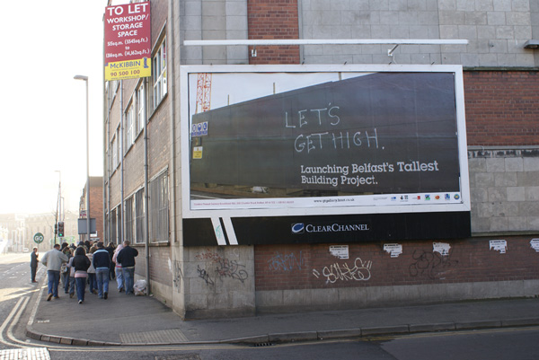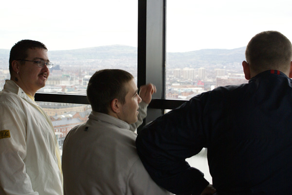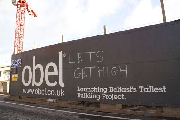 The desire to live and work high in the sky is being promoted again after the developments of 1960's such as the New Lodge and Rathcoole flats. New developments such as Hilton, Obel and the proposed Bedford Square tower are promoting the "qualities" of living high. The suggested morality of the bigger the better is ironically referenced in relation to some of the less desirable living conditions of some of the 60's housing blocks and to slang references to drug abuse. Morality and success is often measured in terms of elevation with phrases like; the high life, the moral high ground, high achievers. This project addresses these ideas and the actual viewpoints by gaining access to the high places in the city for a drawing and photographic project.