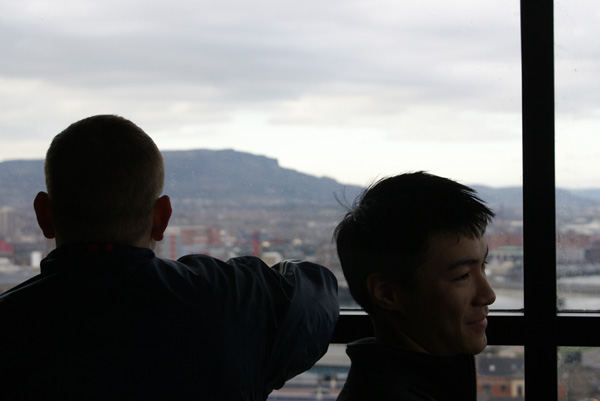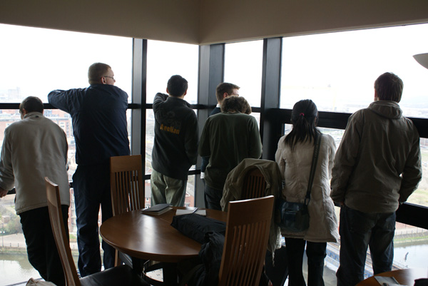 The groups came together to the Hilton Hotel - where we had gained access to the top floor penthouse suite. This was really exciting. Both groups met for the first time and spent an hour in the suite viewing and talking about their city. Interaction between the two groups was quite limited - they did not mix easily - but were respectful of each other and the project. It did not seem possible to initiate drawing workshops - I felt this would have spolied the moment of the groups being there and reacting naturally.