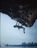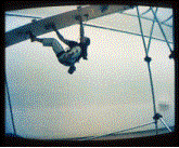 The image is part of a well-known repertoire (‘the individual poised on the boundary between finite and infinite’ (14)) epitomised by the German sublime, especially Casper David Friedrich. A crucial part of this dynamic was the dissolution of the subject-object division in an attempt at oneness with nature.(15) It is interesting to look, however, at the level of separation from the original natural experience. A climber negotiated the route, a photographer represented the climb within the historical context of the sublime. Shipsides replicates this now legendary climb in a gallery space and proceeds to document a climber tackling the simulated climb through video from which is taken a ‘still’ image (illustrated above). Shipsides then presents this footage as a mirrored reflection of the original photographic image. The climb has gone from photograph to physical replication to video to still image to print. Baudrillard spoke of ‘simulation’ as more than pretending, it produces the same symptoms, signs and images as the real and so operates on a different level from the false or true.
