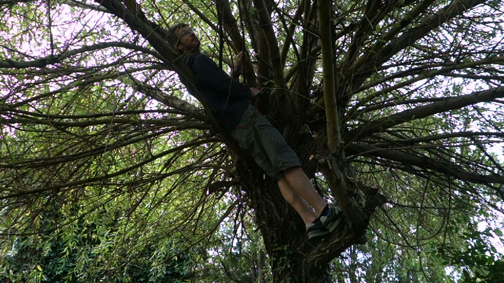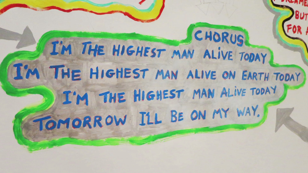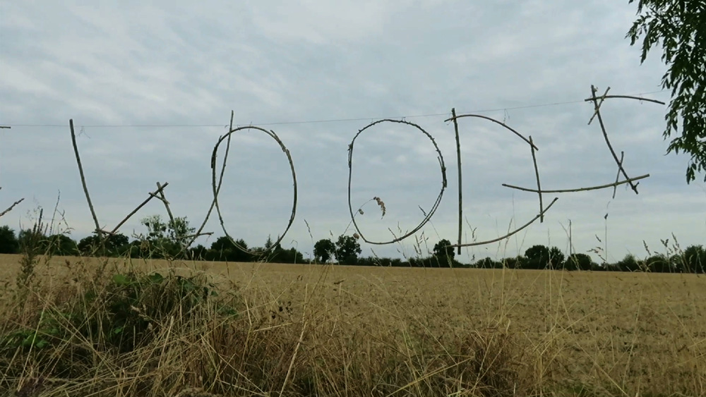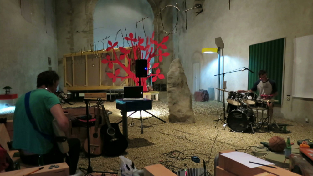 RED FLOWERS ROUNDABOUT is an experimental video work which reflects the live and public process of recording some new songs and making a twig text installation STILL NOT OUT OF THE WOODS in the Chapelle Du Genêteil in Château-Gontier, northern France.