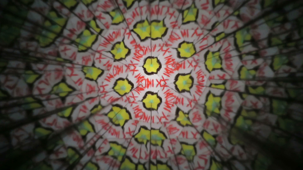 We were invited to take part in a video screening programme (Gothic Cinema) instigated by David Michael Clarke and Anabelle Hulaut, who had an exhibition (Outside-In) in the art centre housed in the chapel. With their permission we took over the ‘park-like’ exhibition installation (much of which beautifully referenced the Magic Roundabout) for a number of days to record our songs, a wall painting and develop the twig text work.