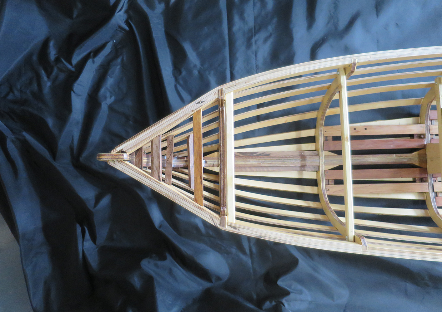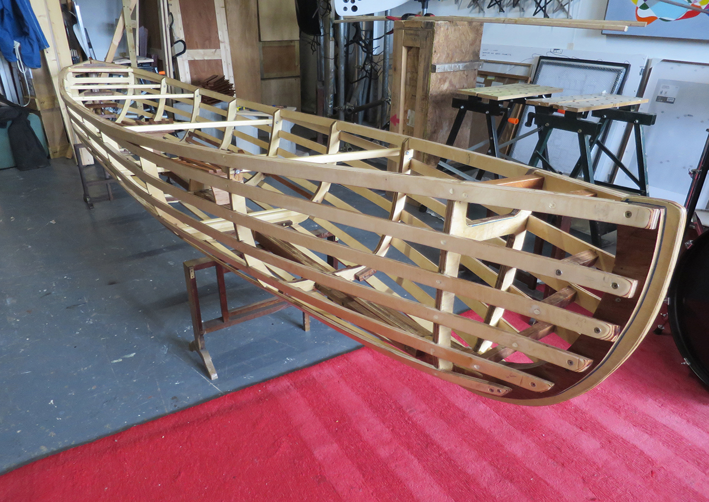 Sheebang is a self-design, and very much a project of creative and cultural hybridity. It draws on knowledges of curraghs, canoes, racing-dinghies, offshore boats, inshore boats, boats seen in museums, long boats, skiffs, out-riggers, and a basic knowledge of how the power of the water, whether sea, lake or river, along with the function of the boat, dictates the design. In this, Sheebang mixes traditional (with curragh style tarred cloth on framework, including some ideas from the framework and shaping of the elegant long and thin Dingle curraghs) and modern (of my father’s sleek wooden racing dinghies and canoes) and local traditional boat building (Alastair Duffin, the last professional wooden boat-builder in Belfast), along with the evolution of the classic generic open canoe (which forms the basic design of most mass-produced plastic canoes) and so I would say that Sheebang is the definition of a hybrid.