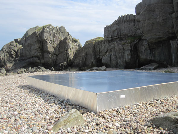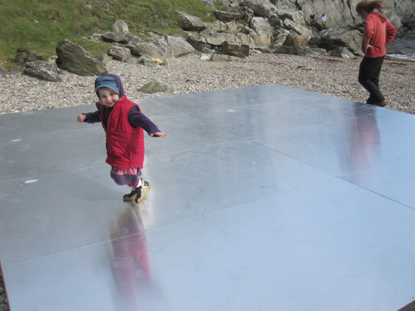 These anxieties nagged away at me as the platform was slowly (it seemed) constructed. Always takes longer than you plan – each evening I would think I’ll be finished by noon the next day. By the end of Thursday, after working 7am – 9pm days it was completed – and WOW!!! anxieties gone – it was fantastic – beautiful. Art and not art – referential (70’s minimalism)and a little bit Pop but completely contextual (Landart) and functional. There’s also a futurist (well at least the metallic machined sheen) and sci-fi essence to it (Dr. Who, 2001). If it had been a stage it would have failed. For me it had to have another presence, exisitence with complex layers of possibilities, functions and registers. For now we are calling it the Platform – but I want to find a better title for it as a piece of art.