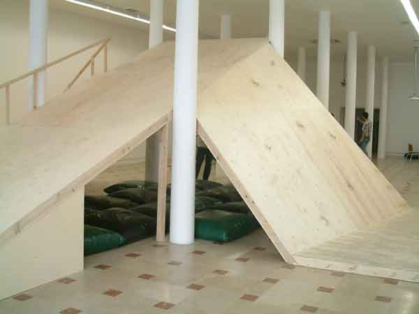 The construction, a series of three slopes, formed a ramp which almost reached the ceiling then a set of steps descending into the gallery and then underneath a “grotto” climbing space - where the more energetic public could climb on the under-ramp.